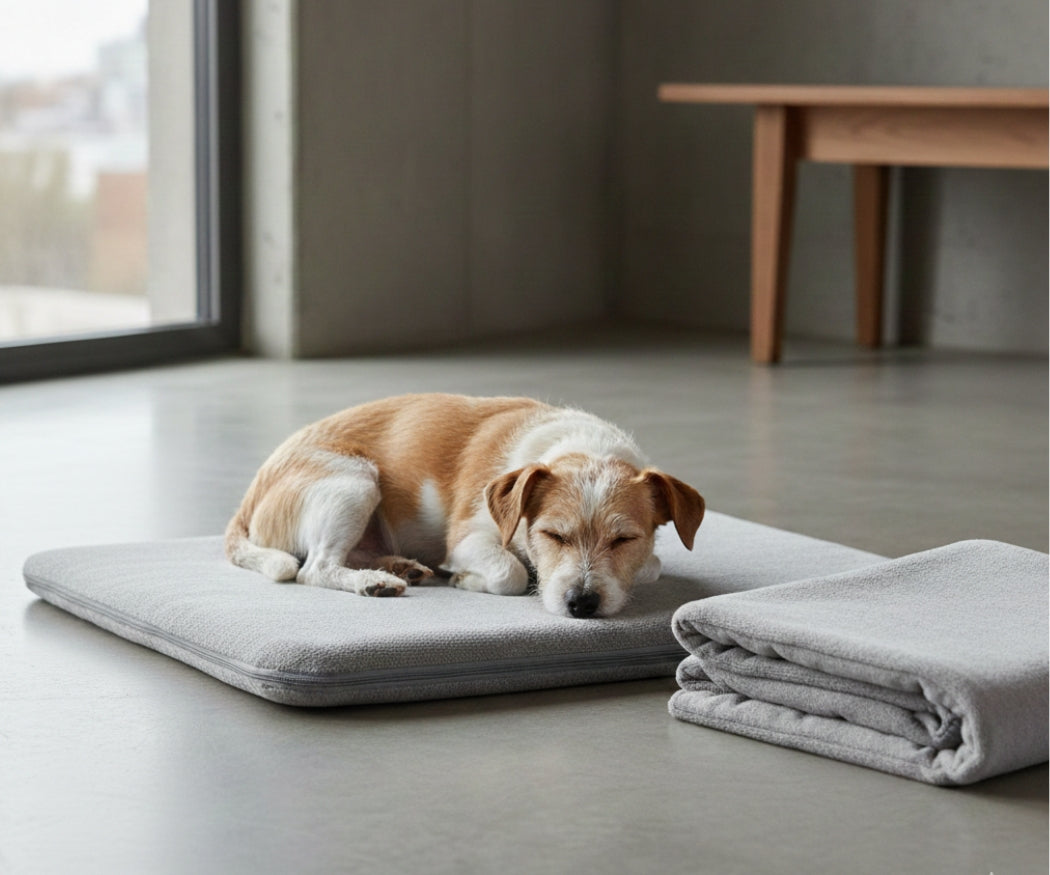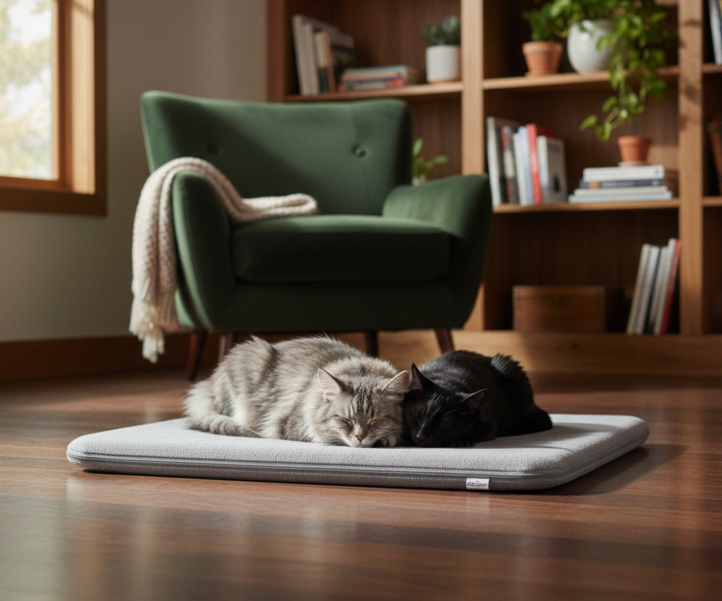 Cold floors can draw warmth away from pets during rest. Buen™ Pet Comfort Mat is designed to help reduce cold-floor chill using a quiet, passive thermal core — no cords, no noise, no setup.
